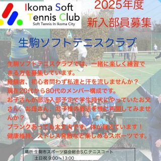奈良県生駒市で活動しているソフトテニスクラブです。 主に土日祝祭日に生駒市内のテニスコートで練習しています。 年齢層はかなり幅広いですが、和気あいあいと練習しています。 学生時代にやっていて久しぶりにソフトテニスしたいな、お子さんが部活に入ったのを機に、初心者の方でも大丈夫です。 是非一度体験参加してみてください。