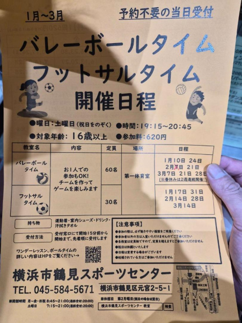 ▼チーム練習のお知らせ(参加自由です) チーム練習として以下日程で鶴見スポーツセンター参加の 個人フットサルに参加します。 ・日程 2月14日19:15 2月28日19:15 ・場所 鶴見スポーツセンター ・料金 650円程度 ▼詳細のチラシは以下UR Lから確認ください。 https://drive.google.com/file/d/1hlgGQIqaa1q4SqwNCqnWXqrndPQSjj2e/view?usp=sharing ▼当日の流れ キックオフは19:15となり、受付は19:00から開始されます。 入り口付近の券売機にて「フットサルタイム」650円程の券をご購入ください 券を購入後、右手の受付にて参加カードを受け取り、その後、体育館に行き参加となります。 スタッフの方がゴールなどを準備していますので ゴールの設置などは、できればご協力をお願いします。 受付完了後はチームで集合しますので、黒色のTシャツを着用している私までまで、お気軽にお声がけください。 また、個人参加になりますので、他にプレイされる方もいらっしゃいますのでぜひ配慮をしていただけると幸いです。 ※私は体育館入り口付近の自動販売機前のベンチにいますのでぜひお声がけください。黒いジャージ、Tシャツを着ています。