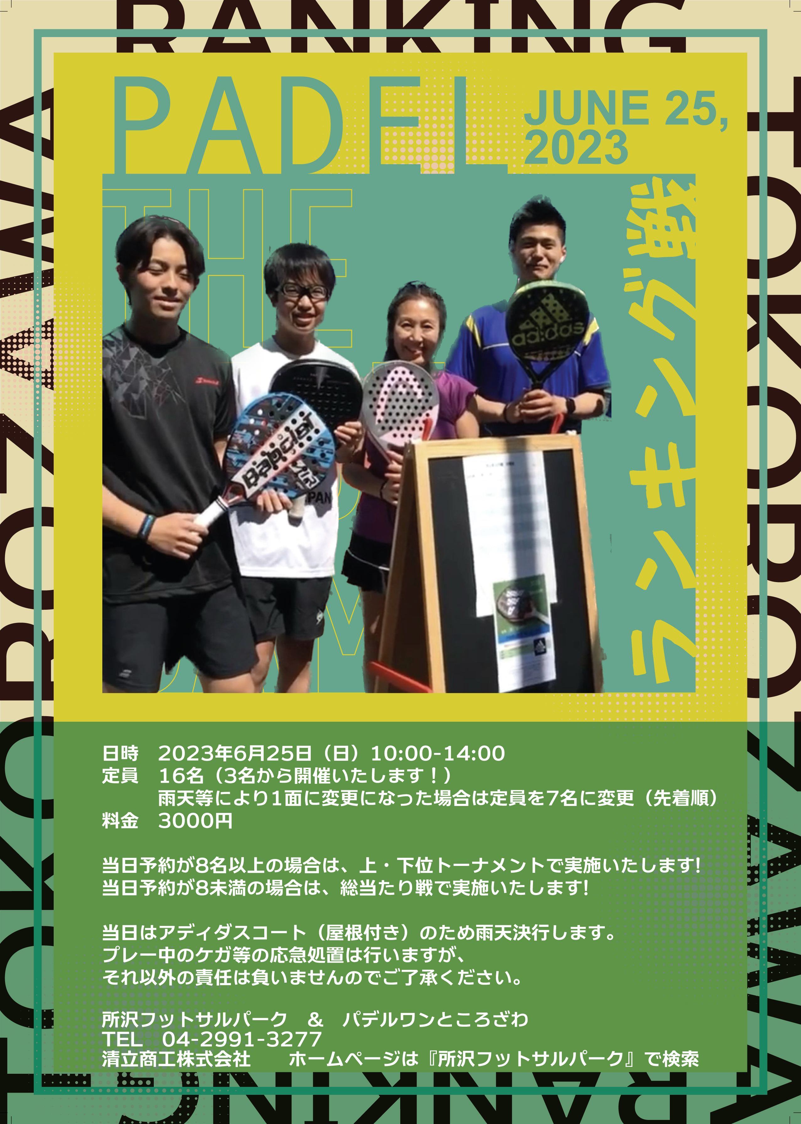 先日雨で流れたパデルワン「ランキング戦」2023年6月のご案内です!