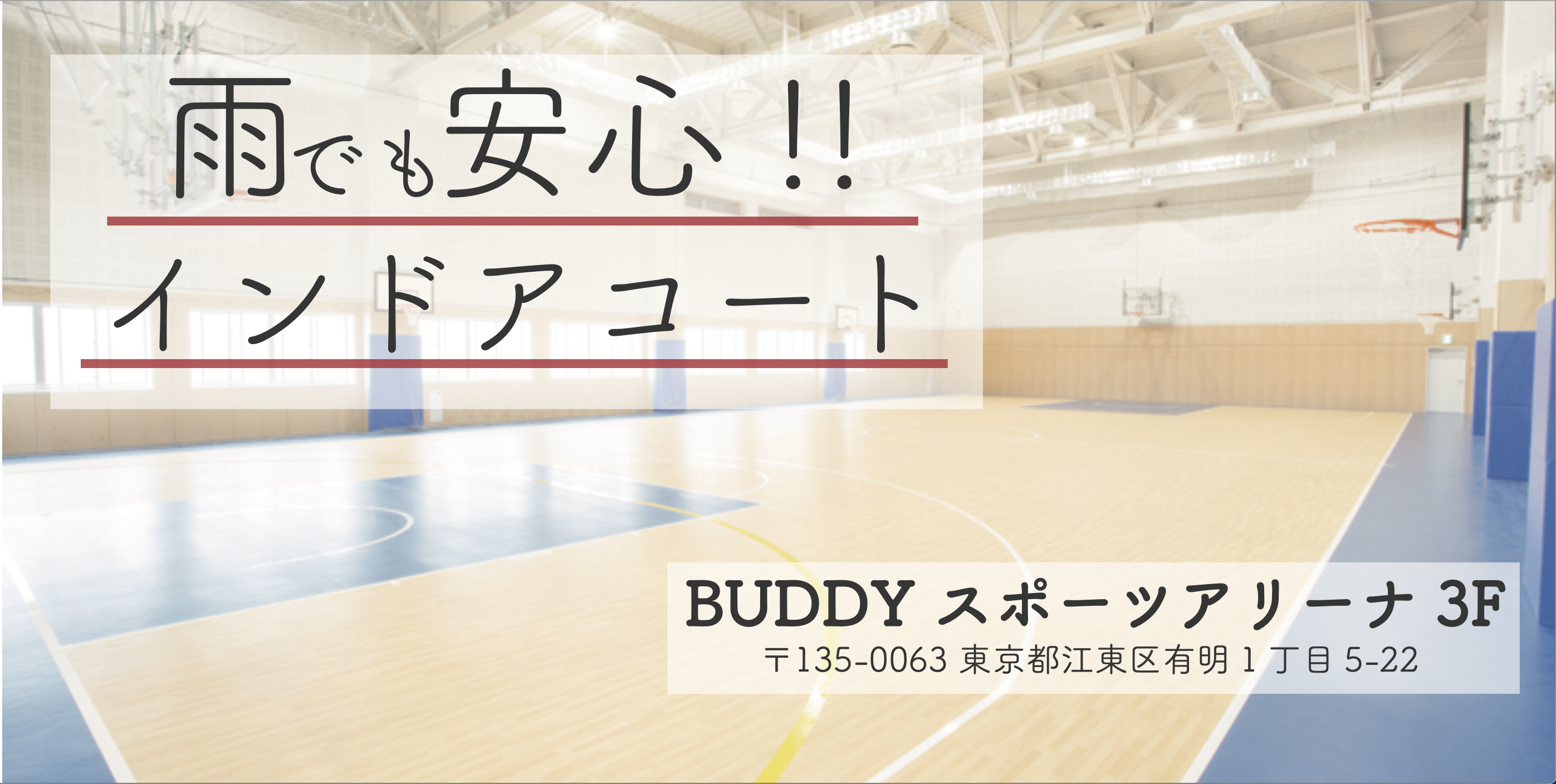 BUDDYスポーツアリーナ 3F 〒135-0063 東京都江東区有明1丁目5-22(Googleマップから確認) |