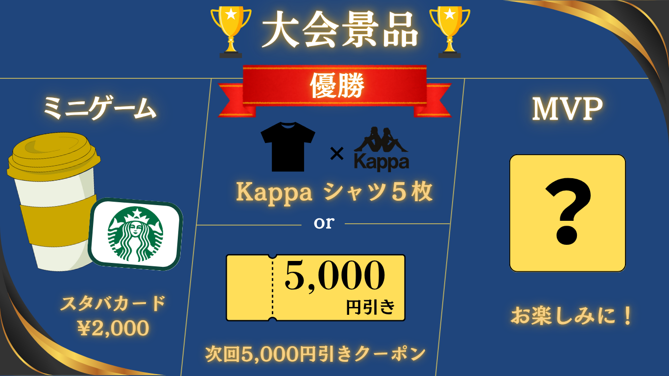〇優勝チーム:Kappa Tシャツ5枚 or 次回大会5,000円引きクーポン