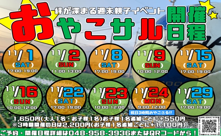 親1名・お子様1名:2,200 円(対象:メンバー/ビジター) 親1名・お子様2名:3,300 円(対象:メンバー/ビジター) 親1名・お子様3名:4,400 円(対象:メンバー/ビジター) 参加費:2,200円 (全員)