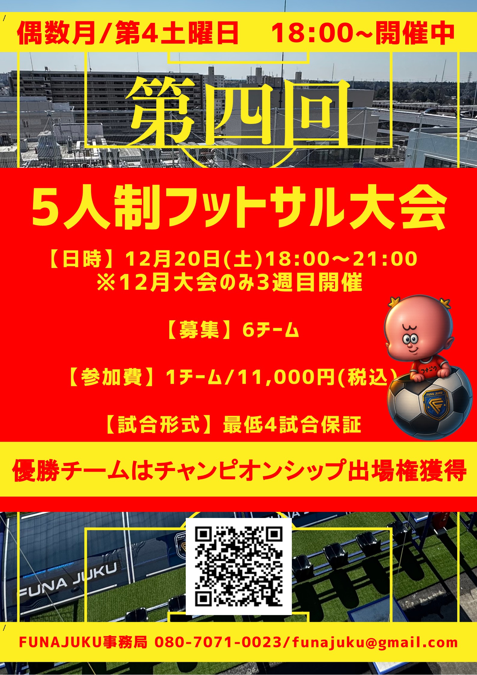 FUNAJUKUフットサルコートリニューアルにて2面同時開催が可能となった5人制フットサル大会を開催します★
