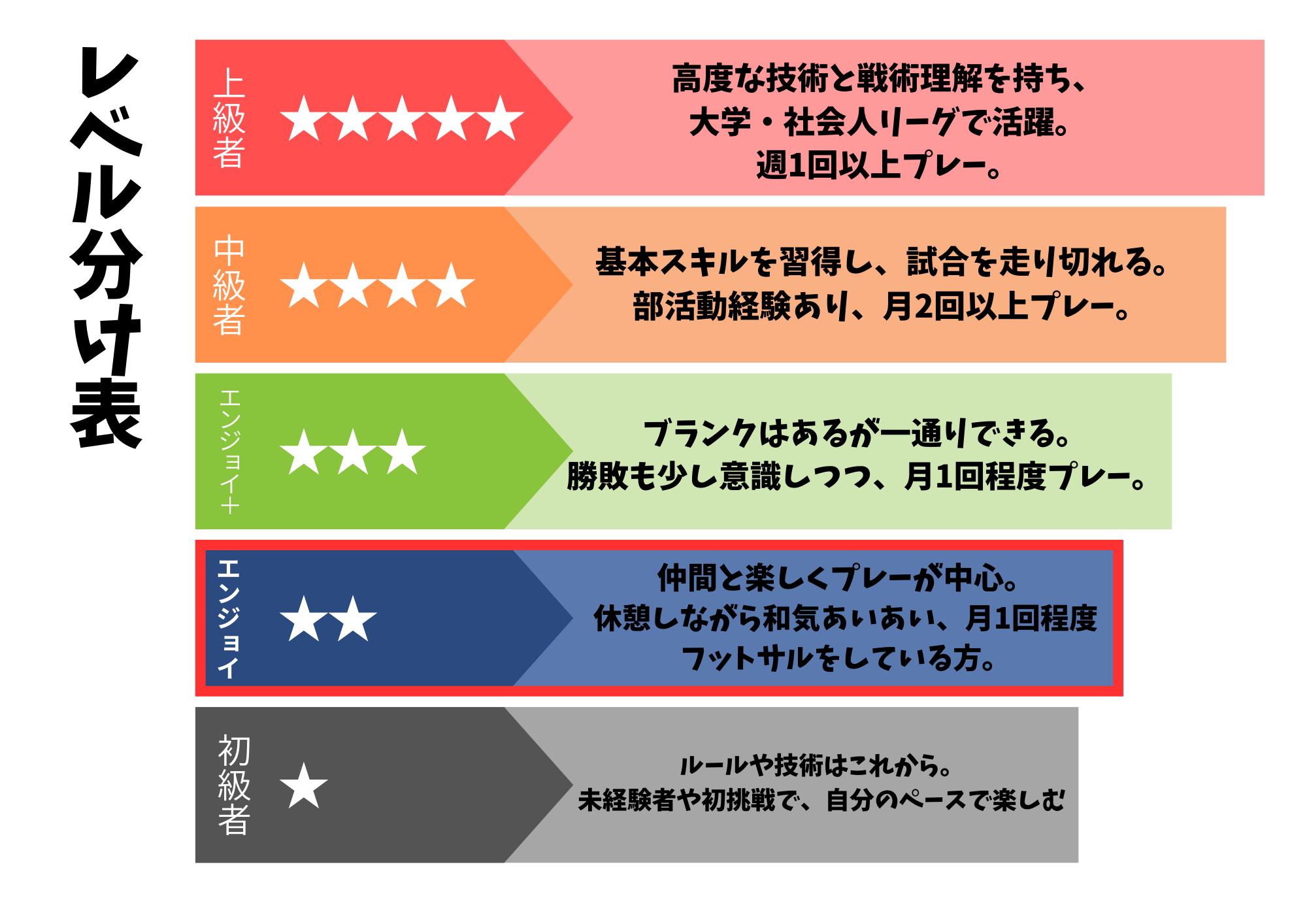 | 対象クラス | エンジョイ(備考:【エンジョイ志向で楽しく安全にプレーできるチームを募集します】) |