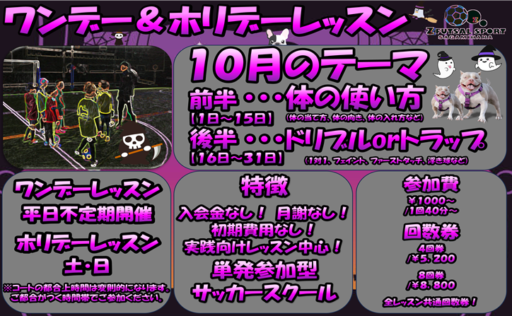 参加費(40分):1,300 円(対象:メンバー/ビジター) 回数券:0 円(対象:メンバー/ビジター) 単発参加型Zサッカースクールです♪