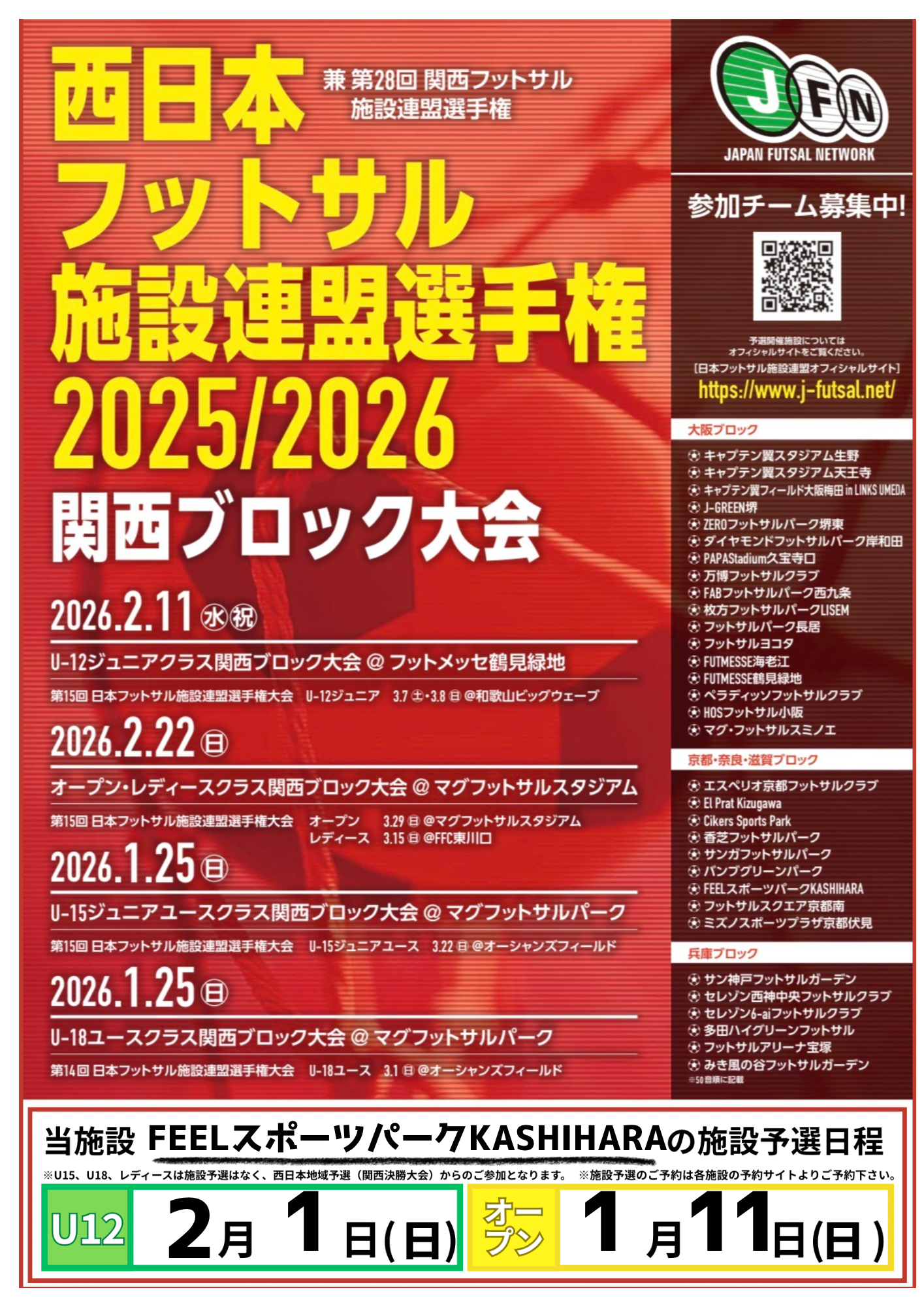 FEELスポーツパークKASHIHARAの施設予選で優勝チームしたチームは2026年2月22日(日)マグフットサルスタジアムで行われる関西大会への出場✨
