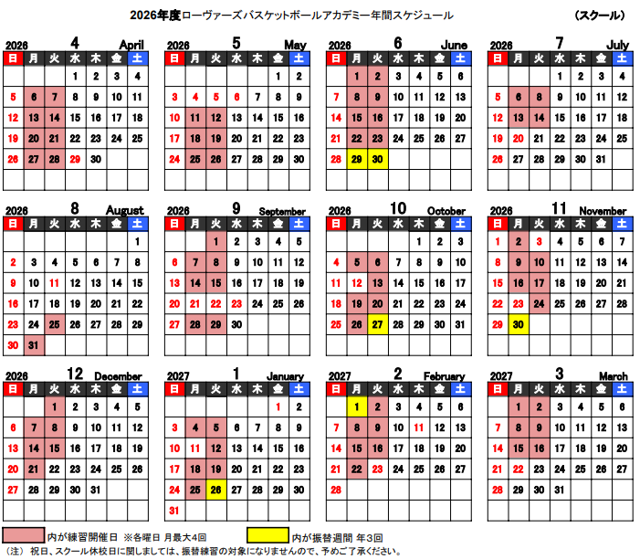 ※祝日はスクールがございません。年間カレンダーをご参照ください。