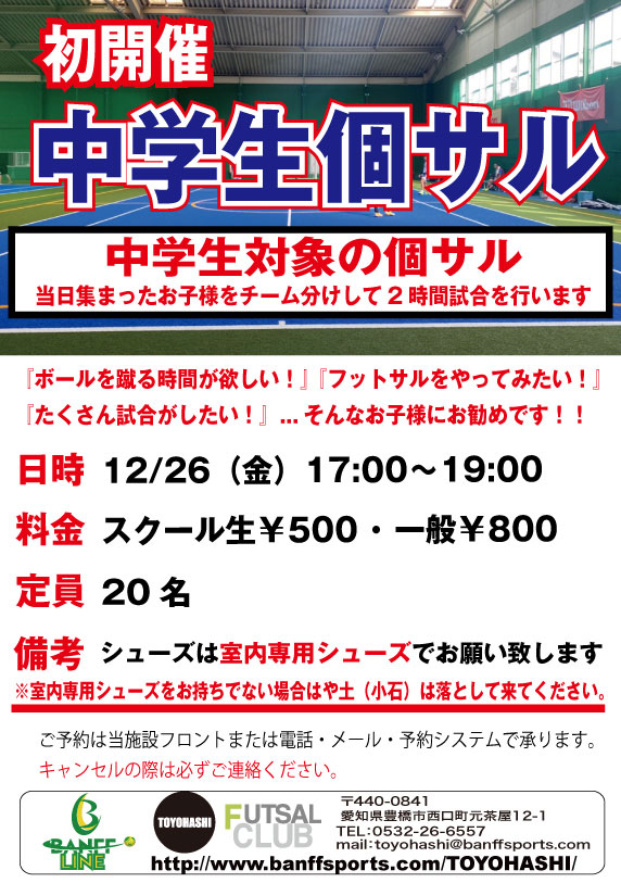 豊橋フットサルクラブ(インドアCコート) 愛知県豊橋市西口町元茶屋12-1 (Googleマップから確認) |