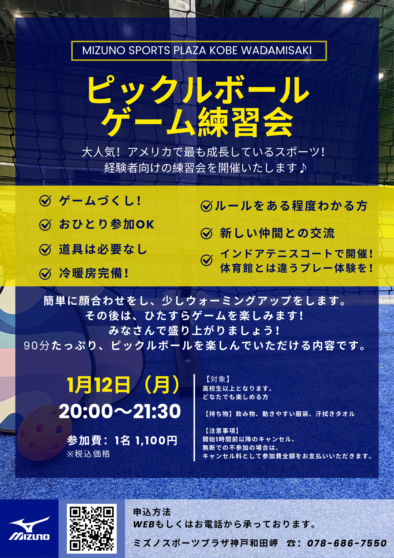 ミズノスポーツプラザでは初めて参加される方やお一人で参加される方でも安心して参加できるプログラム運営を心掛けております。ピックルボールを通じて新しい仲間との出会いや交流を深めていただく機会となることを願っております。