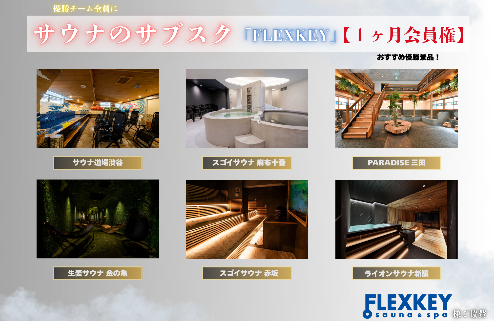 都内でサウナのサブスク事業を展開するFLEXKEY様のご協力により、優勝チームの全員に厳選したサウナ施設(FLEXKEY1ヶ月会員権)をご用意!