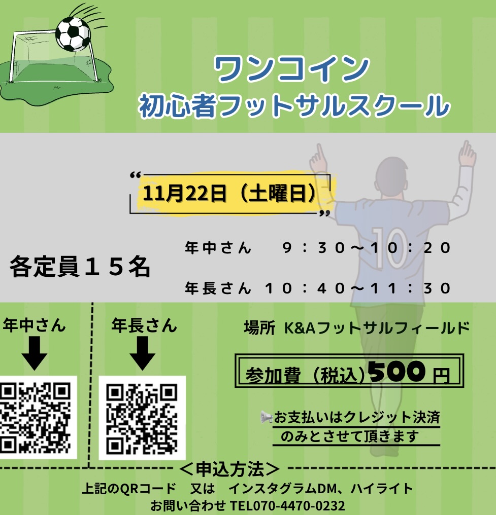 ※初心者フットサルスクールではキャンセル料等発生しません。またキャンセルの場合はお電話にてご連絡お願いいたします。