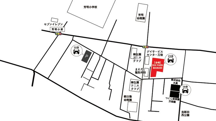 | 説明 | トイレ:男女別にあり 駐車台数:23台(無料) ※18時からはつくし保育園万倍校の駐車場も18台使用可 ※18時からはダイシン駐車場(岡山県岡山市南区万倍23番2)も10台使用可 ナイター設備:あり ※ONは手動。22時15分に自動でOFFになります。 セキュリティ:防犯カメラの設置 |