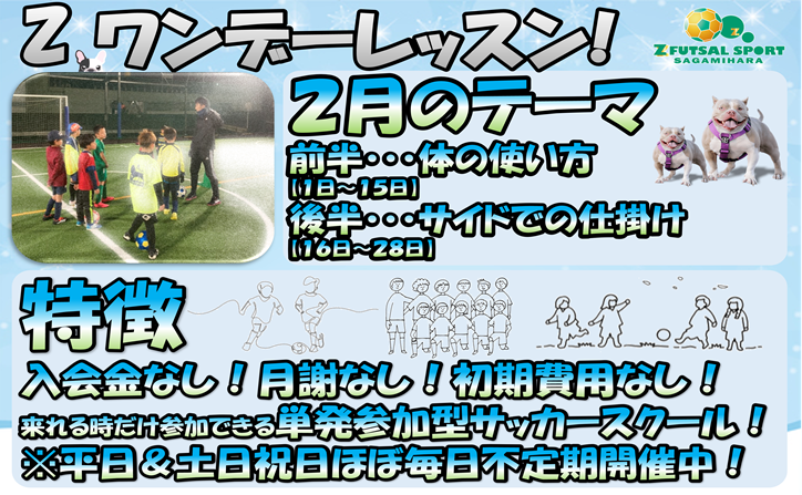 フィジカルトーレーニング&通常レッスン≪小4~6年生対象≫参加費(80分コース):2,200 円(対象:メンバー/ビジター) フィジカルトーレーニング&通常レッスン≪小4~6年生対象≫回数券2個消化(80分コース):0 円(対象:メンバー/ビジター) 単発参加型Z冬期講習サッカースクールです♪