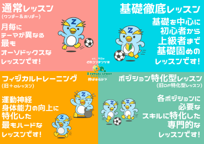 通常レッスン≪1~3年生対象≫:参加費:1,300 円(対象:メンバー/ビジター) 通常レッスン≪1~3年生対象≫:回数券:0 円(対象:メンバー/ビジター) 単発参加型Zサッカースクールです♪
