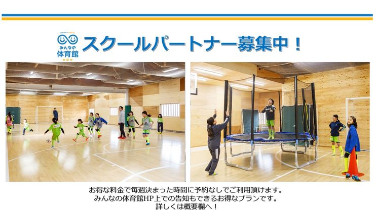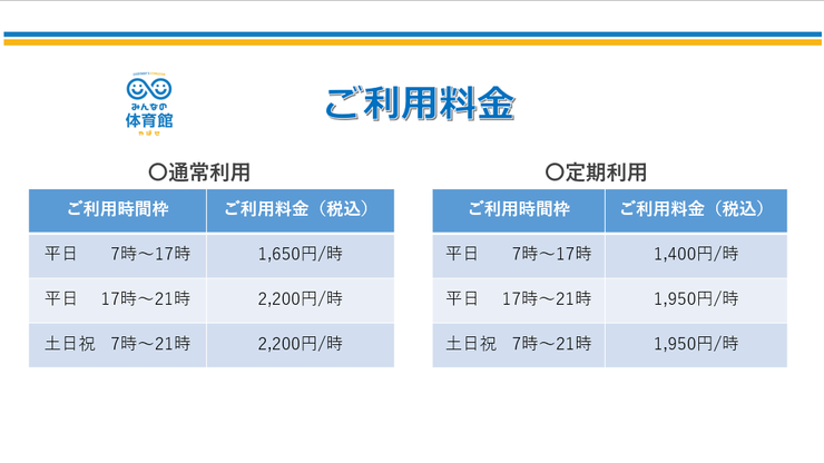 | 利用料金 | 【通常利用】 好きなときに好きなだけ利用ができます! 平日 7:00~17:00:1,650円/h 平日 17:00~21:00:2,200円/h 土日祝 7:00~21:00:2,200円/h →スポットで利用したい方はこちらの料金となります。 【長期利用】※スクールパートナー様向けプラン!! 面倒な予約業務をなしに毎週決まった時間にスクールを実施することができます。 契約期間は原則1年となりますが、契約希望はお気軽にお問合せください! 平日 7:00~17:00:1,400円/h 平日 17:00~21:00:1,950円/h 土日祝 7:00~21:00:1,950円/h 年間契約を頂いた方は通常利用料金から250円/hお値引きさせて頂く形になります! またみんなの体育館の予約サイト上で告知し集客につなげることができます! 予約の手間を省き、毎週決まった時間に利用したい方にオススメです!! |