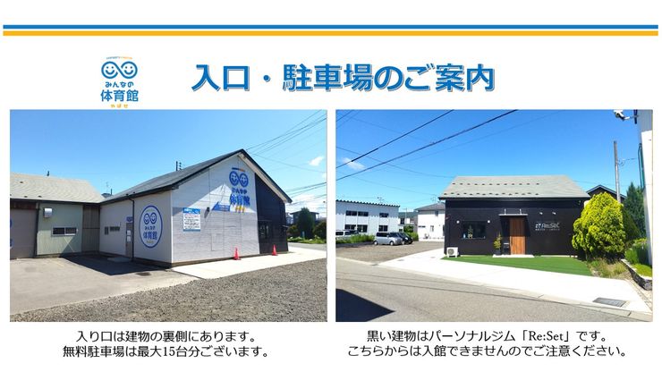 | アクセス | 山王大通からJAビルとケーズデンキの間を進むと左側にあります! 「みんなの体育館やばせ」の看板が目印で、入り口は道路から見ると裏手にあります。 メールでお送りした入館パスワードを入力してお入りください。 ※パーソナルジム「Re:set」様の入り口からは入れませんのでご注意ください!! |