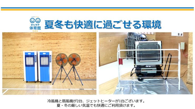 | サービス | 【フットサル】 ●フットサルゴール×2●サッカーボール×4●フットサルボール×3 【バスケ】 ●バスケゴール×2●バスケットボール×1 【卓球】 ●卓球台×2●卓球ネット×2●卓球ボール×24 ※現在、卓球台故障中につき1台使用禁止となっております。 【その他】 ●トランポリン×1 ●スラックライン×2 ●バランスボール×7 ●トレーニングチューブ×20 ●モルックセット×1※マットのご用意はございません。 【冷暖房設備】 ●扇風機×2(夏季限定)●冷風機×1(夏季限定)●灯油ストーブ×1(冬季限定) 【その他】 ●待合室(※体育館内のお子様の様子を映像で確認することができます!)●椅子×6●長テーブル×2●トイレ(男1女1)●自動販売機×1 |