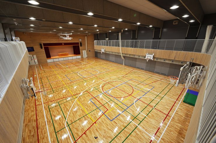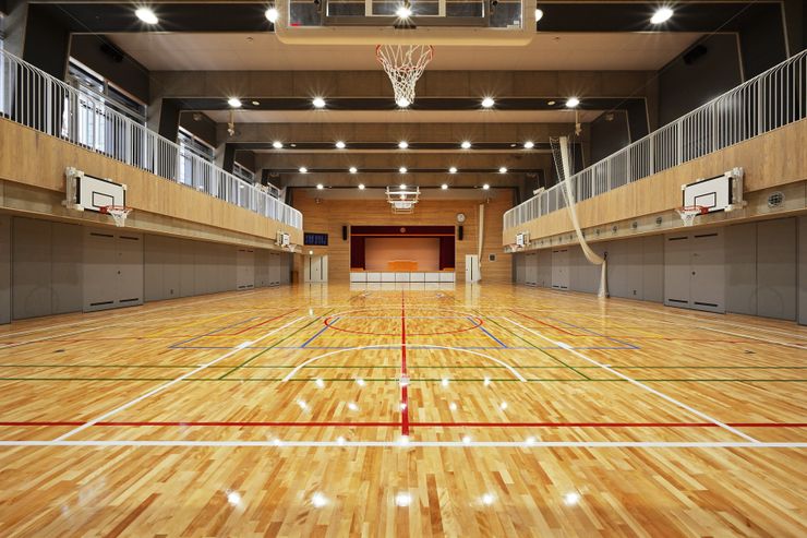 ■バスケットボールコート336㎡ 面積約:524㎡(ステージ除く) 天井高さ:7/7.9m ■メインバスケットボール:1面(24×14m) 半面バスケットボール:2面(10.2×15m)ゴール高さミニバスサイズ ■バレーボール:1面(18×9m) ■バドミントン:3面(13.4×6.1m) 【禁止種目】 ボールを蹴る種目(フットサルなど)、バトントワリング、車いす競技、ドローン、その他床や壁面を傷つける恐れのある種目