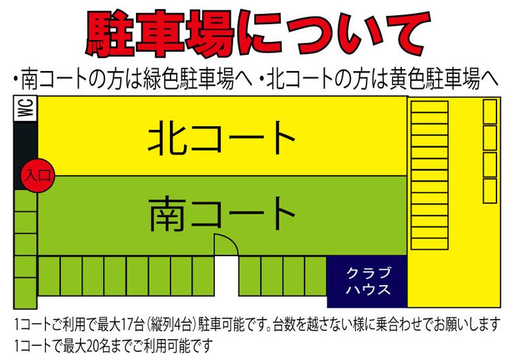 | 利用料金 | ■レンタルコート料金 【メンバー】 ●年会費 / 4000円 《特典》 従来通りの料金でご利用可能 3ヵ月前からご予約可能(ビジターは1ヵ月前) 【平日 9:00~12:00(3h)】 ●メンバー/4000円 ●ビジター/6000円 【平日 13:00~17:00(4h)】 ●メンバー/4000円 ●ビジター/6000円 ※水曜日・金曜日は13:00~16:00(3h) 【平日 18:00~20:00(2h)】 ●メンバー/11000円 ●ビジター/13000円 【月・木曜日 20:30~22:30(2h)】 ●メンバー/11000円 ●ビジター/13000円 【火・水・金曜日 20:30~22:30(2h)】 ●メンバー/13000円 ●ビジター/15000円 【土・日・祝日 9:00~12:00(3h)】 ●メンバー/11000円 ●ビジター/13000円 【土・日・祝日 13:00~17:00(4h)】 ●メンバー/11000円 ●ビジター/13000円 【土・祝日 18:00~20:00(2h)】 ●メンバー/11000円 ●ビジター/13000円 【土曜日 20:30~22:30(2h)】 ●メンバー/16000円 ●ビジター/18000円 【祝日 20:30~22:30(2h)】 ●メンバー/11000円 ●ビジター/13000円 <特別期間> ゴールデンウイーク・お盆・年末年始は、祝日料金になります |
