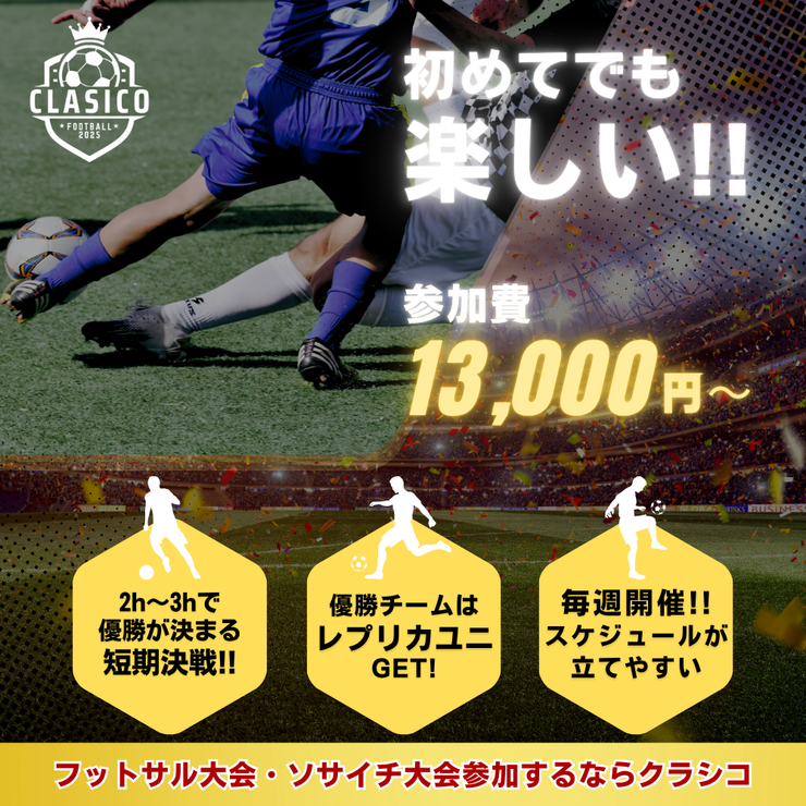 | 説明 | フットサル&ソサイチの楽しい一日を提供! ⚽ 短期間で楽しめる大会開催! ワンデイで完結するフットサル&ソサイチの大会 忙しい方でも気軽に参加できる、1日限りのイベント 📅 開催スケジュール豊富 毎月定期開催!予定が立てやすい 初心者から上級者まで参加OK、レベルに合わせた組み合わせ 🎉 仲間と一緒に、全力で楽しもう! チームメンバーでの参加OK、個人での参加も歓迎 友達同士や会社の同僚と気軽に参加できる大会 🏆 参加賞や特典も充実! 優勝チームには豪華賞品をご用意 参加者全員に記念品や特典あり 🛠️ 完全サポート! 大会運営から会場手配まで安心のサポート 初めてでも安心して参加できる環境 |