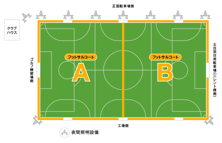 | 利用料金 | ・利用料金(1面):1,000円/60分(税込) ・夜間利用料金(1面/夜間照明付):1,200円/60分(税込) ※全面ご利用になる場合は、Aコート・Bコートそれぞれ必ずご予約願います。 ※料金の決済は、銀行振込のみとなります。フットサルコート利用後~1週間以内に指定の銀行口座までお振込みいただきます。 |
