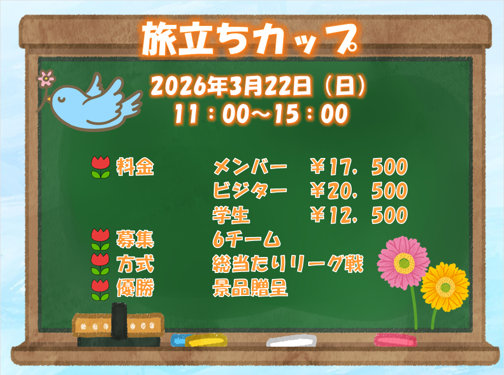 登録チーム:17,500 円(対象:メンバー) 未登録チーム:20,500 円(対象:ビジター) 学生チーム:12,500 円(対象:メンバー/ビジター) ※学生の方は当日学生証の提示が必須となります